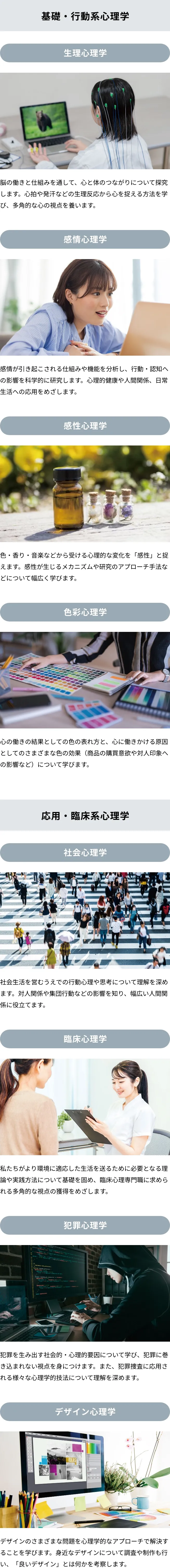知覚や認知、動機づけ、情動など、人間の心のメカニズムを理論的に研究・解明し、あらゆる人間の行動が身体内部および外部環境とどのようにかかわり合いながら、形成されていくのかを分析します。