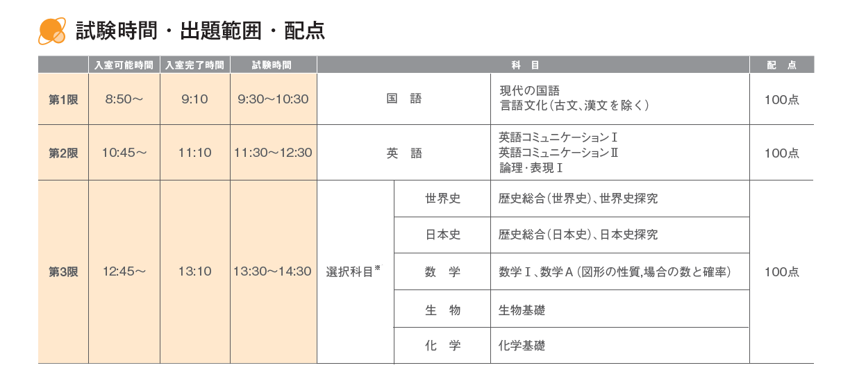 学力優秀者奨学生選考試験 試験日程等 出願期間 2026年1月5日(月)~1月18日(日) 試験日・ 試験会場 2026年1月30日(金) 名古屋キャンパス 結果発表日 2026年2月10日(火) ※専願入試で東海学園大学への入学が決定している方が対象です。 試験時間・出題範囲・配点 ※「選択科目」の受験科目は試験当日選択制です 本学試験会場の開場時間は午前8時30分です。 午前9時10分までに指定された試験室に入室してください。 試験室は、試験当日に指示します。 受験上の注意についての詳細は、学生募集要項2026 P34を参照してください。 学生募集要項2026