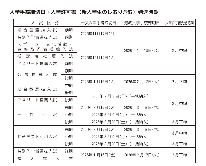 入学許可書の発送時期について 本学の入試に合格された方で締切日までに入学金および授業料等納入金のお振込手続が完了されている方には、 入学許可書を発送いたします。発送時期は下記のとおりです。 ※合格通知へ同封している「入学手続案内」P.3にも記載がございますのでご確認ください。